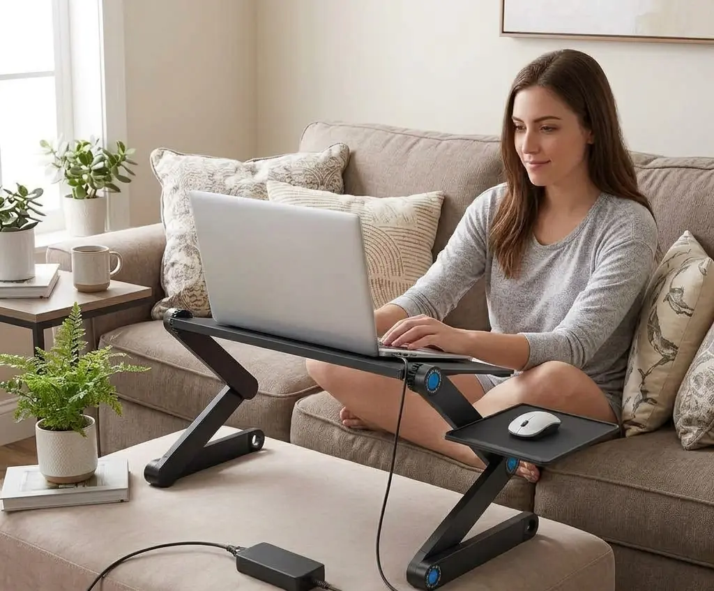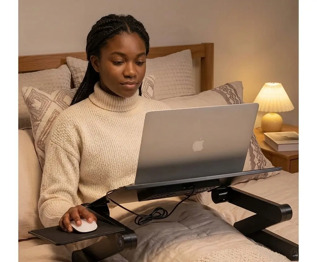 Trabajar desde la cama, el sofá o un escritorio improvisado no tiene por qué ser incómodo ni poner en riesgo tu equipo. Nuestra mesa portátil está diseñada para darte la libertad de trabajar donde quieras, manteniendo tu postura alineada y tu procesador siempre fresco.